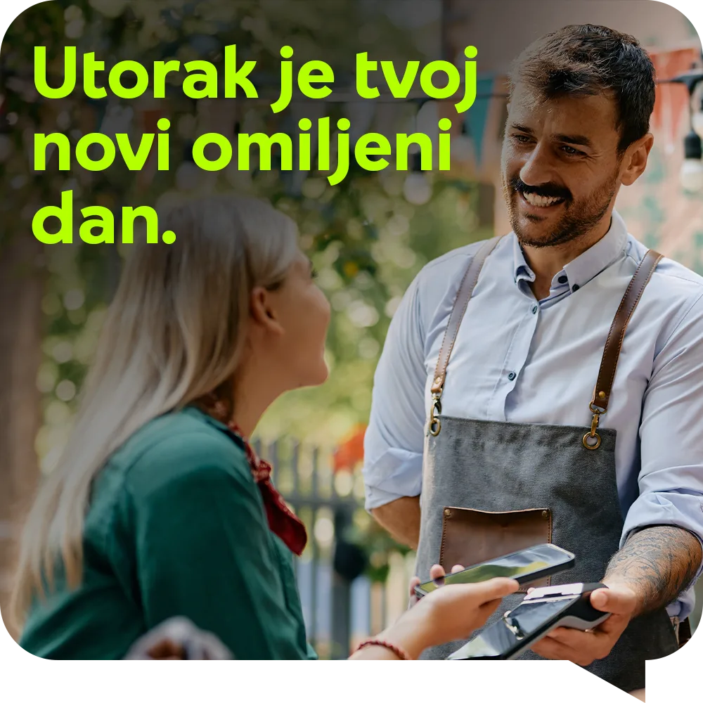 U periodu od 1. oktobra 2025. do 31. marta 2026. svakog utorka, možeš ostvariti 10% keš-beka* za plaćanje našim Mastercard karticama unutar digitalnog novčanika (Google Pay, Apple Pay) u ugostiteljskim objektima koji služe hranu i piće u Srbiji.